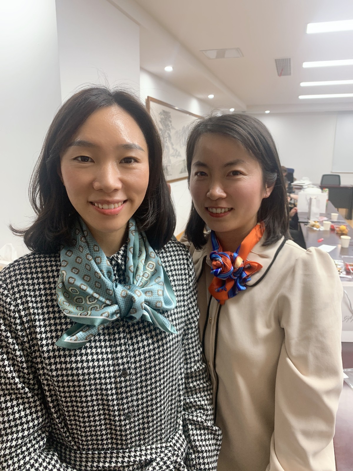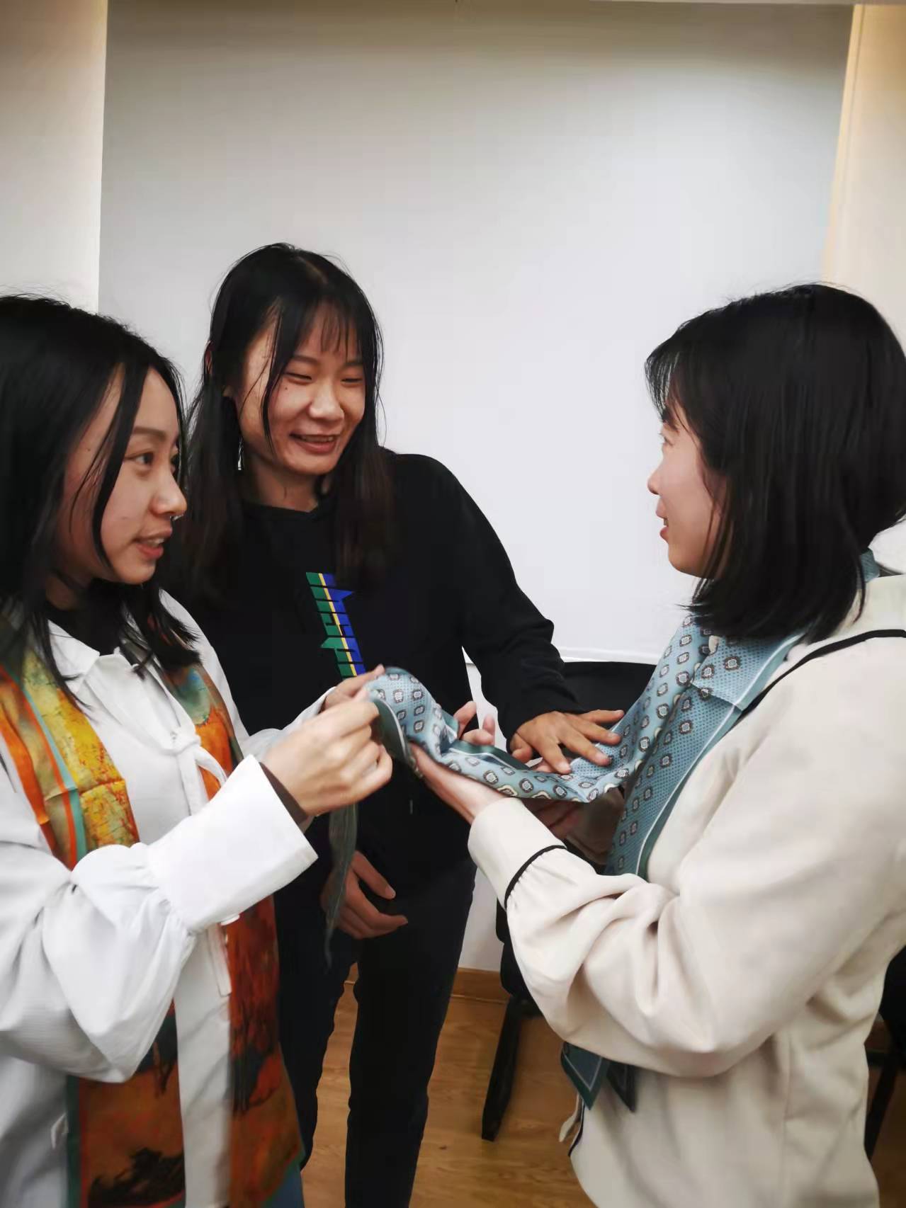 大家快樂地打開“絲巾”盲盒后,一起學(xué)習(xí)了多種系絲巾方法。大家享受著搭配色彩、設(shè)計(jì)造型、相互系絲巾帶來的樂趣和美好體驗(yàn),展示著各自的才藝。